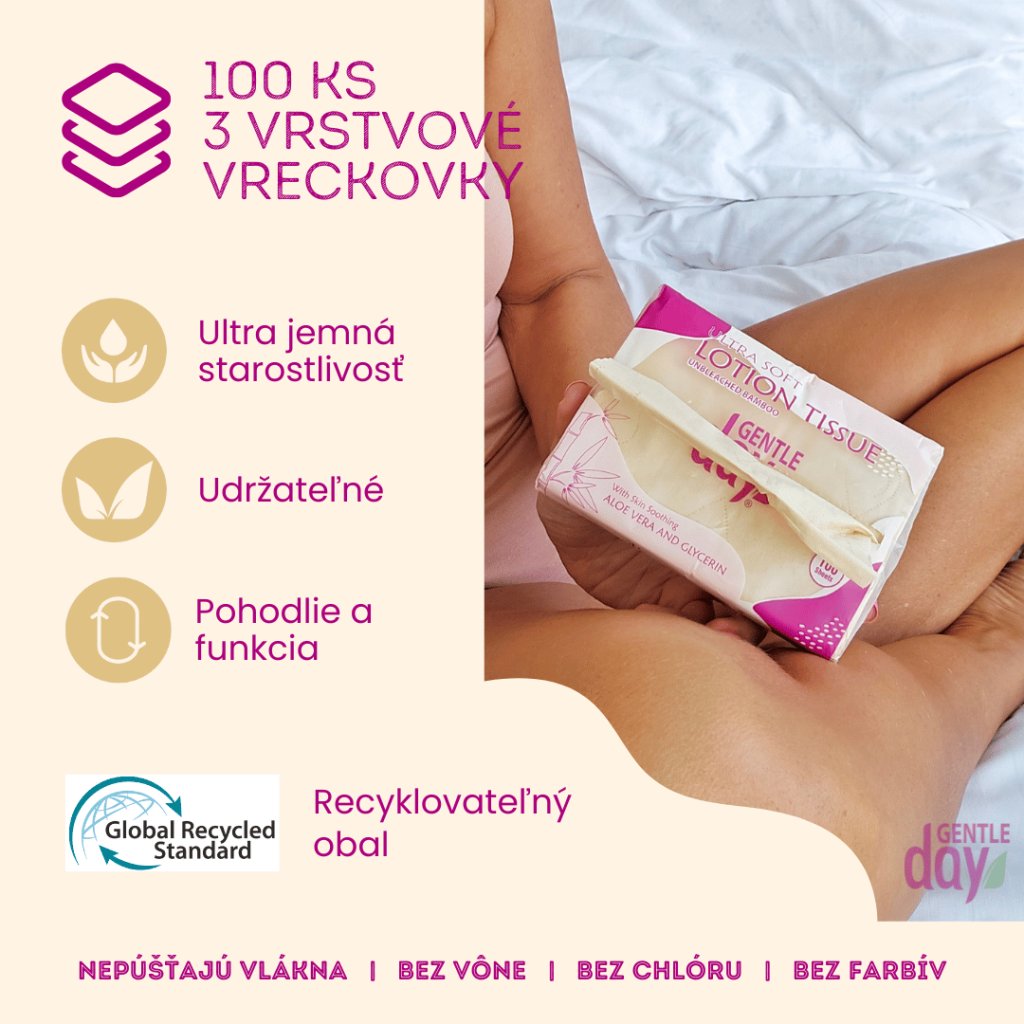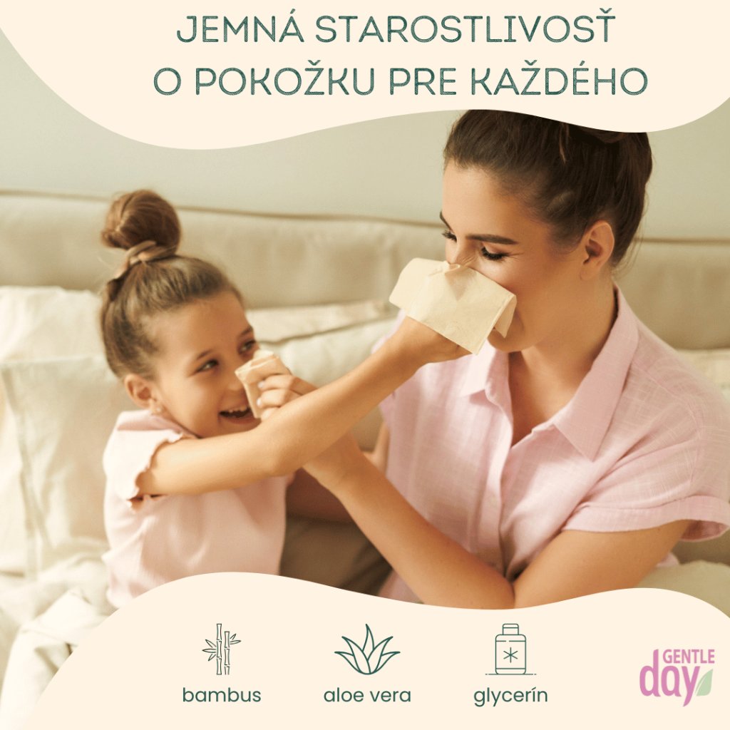 Hledáš kapesníčky, které jsou ultra jemné, nepouští vlákna a jsou šetrné k nosu? S tímto výhodným kartonem získáš 24 balení × 100 ks bambusových jemných kapesníčků Gentle Day se 25 % slevou a s dopravou zdarma. Perfektní na sezónu rýmy, pro rodiny s dětmi, alergiky i na každý den do koupelny či kabelky.